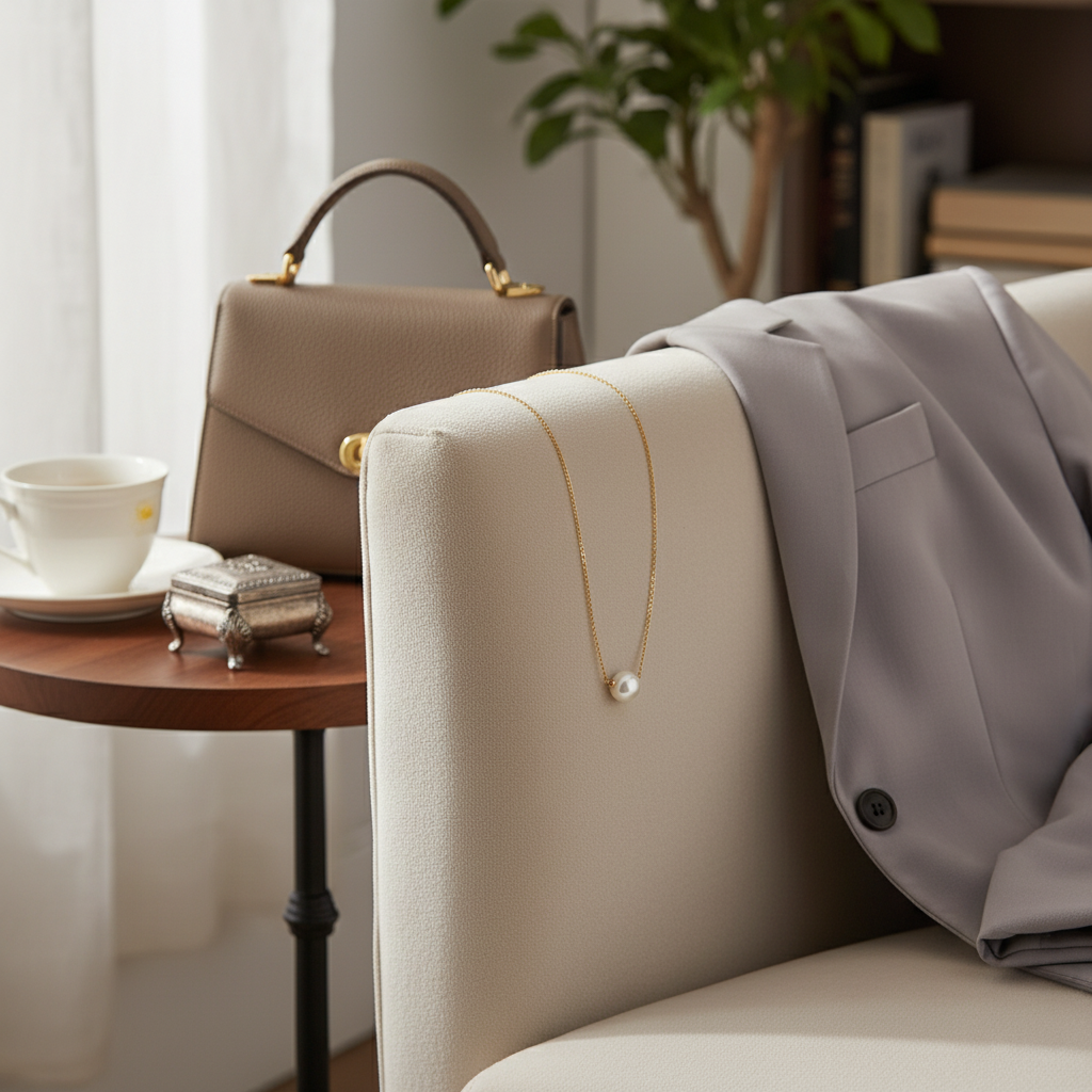 One Natural Pearl Necklace in a signature jewelry box and pouch.